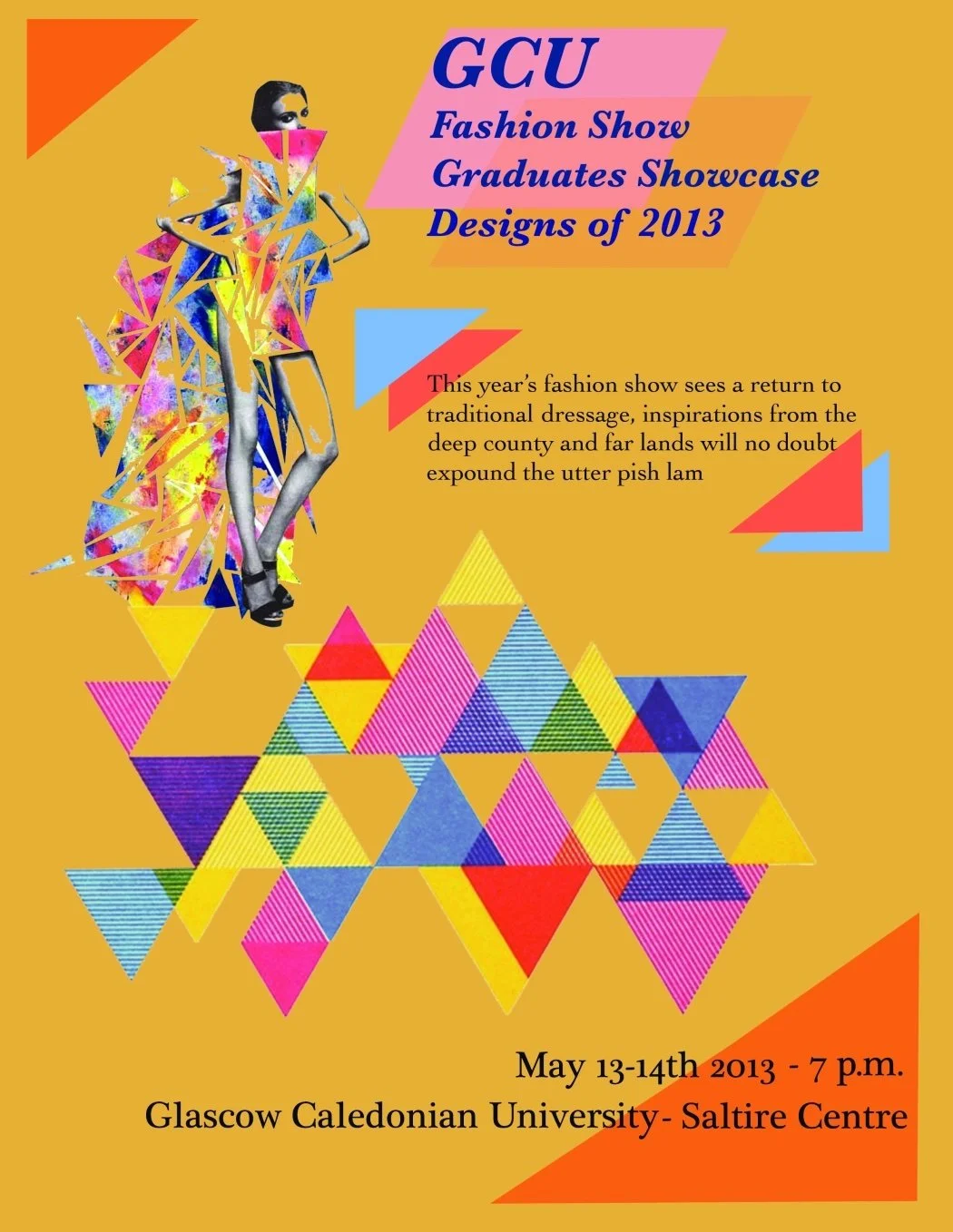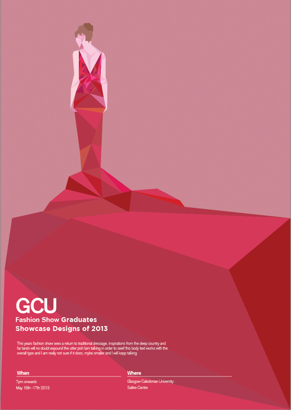 On this assignment, I came across a fashion poster that initially caught my eye for it’s simplistic design. I personally adored the colors of pink (my favorite color) and the geometric shapes. Although its visual appeal is simple, I decided to focus more on the geometric shapes and bring in a range of colors to make the poster more eye catching and bold. I want the reader to not only stop and read the poster but to also increase their interest in going to this event.