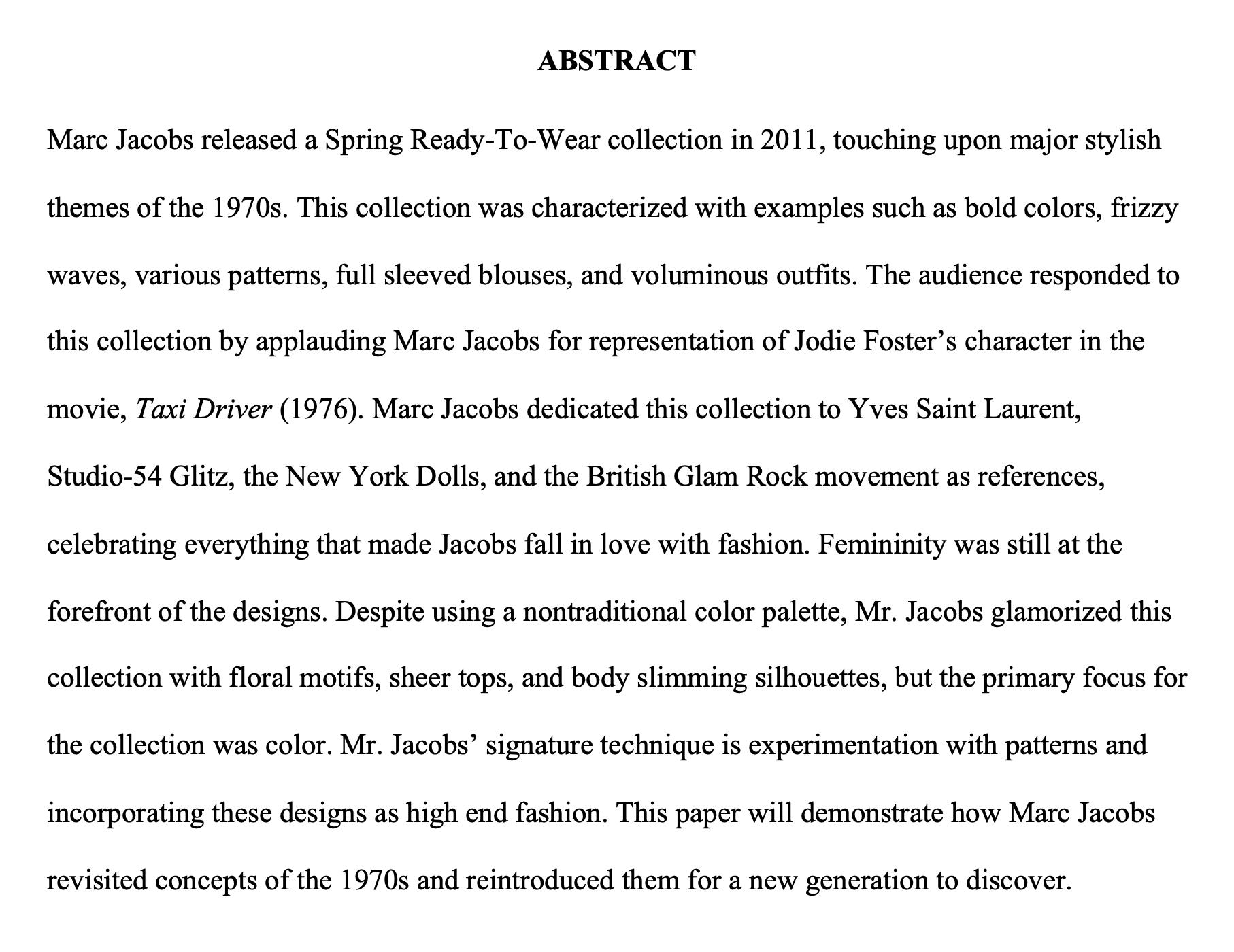 When I began finding my own style, I took inspiration from the trends of the 70s and wore flared pants, cropped turtlenecks, and colorful boots. I took that into consideration when finding time to analyze a collection that took inspiration from previous decades. The Marc Jacobs 2011 Spring Ready to Wear takes different elements of the 70s, taking inspiration from Studio 54, New York Dolls, Taxi Driver (1976) as this article states, and brings them to the runway. These references are what made Marc Jacobs fall in love with fashion to begin with. I enjoyed the research process for this project because I was able to look through the different looks from the collection and realized how much I wanted to recreate these looks myself. Please take a look at my full paper below.